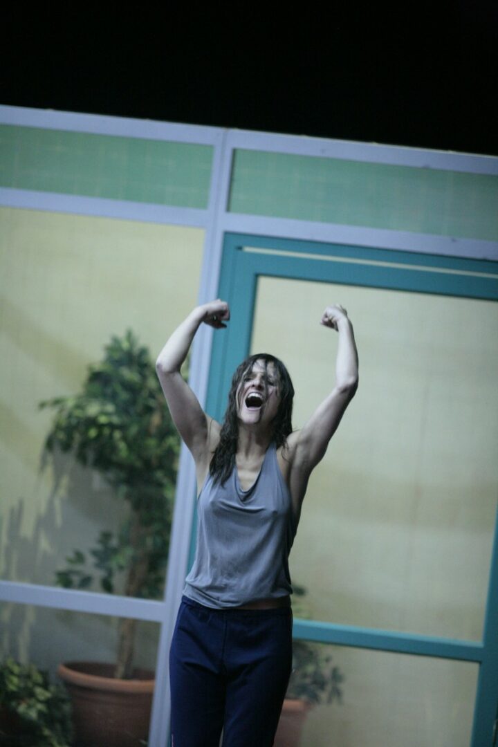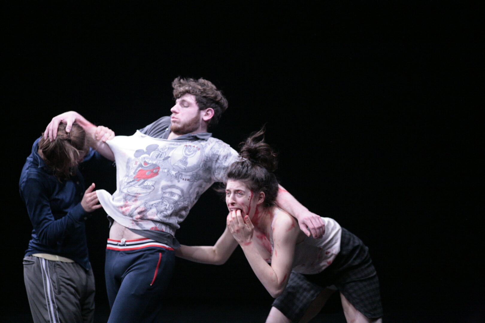 In the attempt to overcome void and depression imposed by the starkness or the dance studio, Godder tests her ״powers״ in a creative process with the other performers. In the creepy yet sporty atmosphere of the studio, they play with instincts and transformations which arise from the uneasiness and void. The tension that exists between process and product, and the desire to overcome it, sparks bouts of violence, which evolve into intimate moments, and allows the work to enter a more risky ground. The intensity built, becomes a platform for playing out ״bigger than life״ images, inspired by recollections of cinematic moments, to create a very particular performance language. All of these are a continuation of Godder’s research into taking on images which may be alienating and far from our perception of ourselves, and seeing how our individuality deals with these exterior identities in performance, at once identifying with and rejecting them.