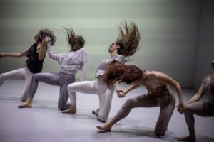 In a truly alchemical performance, a fist thrust into an open mouth, a thumb stretching the side of the temple, hands sheltering the knees- these are distilled manifestations of emotion embodied in form, glowing like gemstones the dancers mine from the depths. In an act of craftsmanship, the choreography weaves them together in an unexpected, stormy, ever-changing way- a dazzling piece of artistry made of encounters and separations, of interdependence and autonomous movement. The choreography seems to allow us to peer through a powerful microscope at the constant motion beneath the surface, and the dancers- like cells that merge and divide – infect one another with a shared emotion.